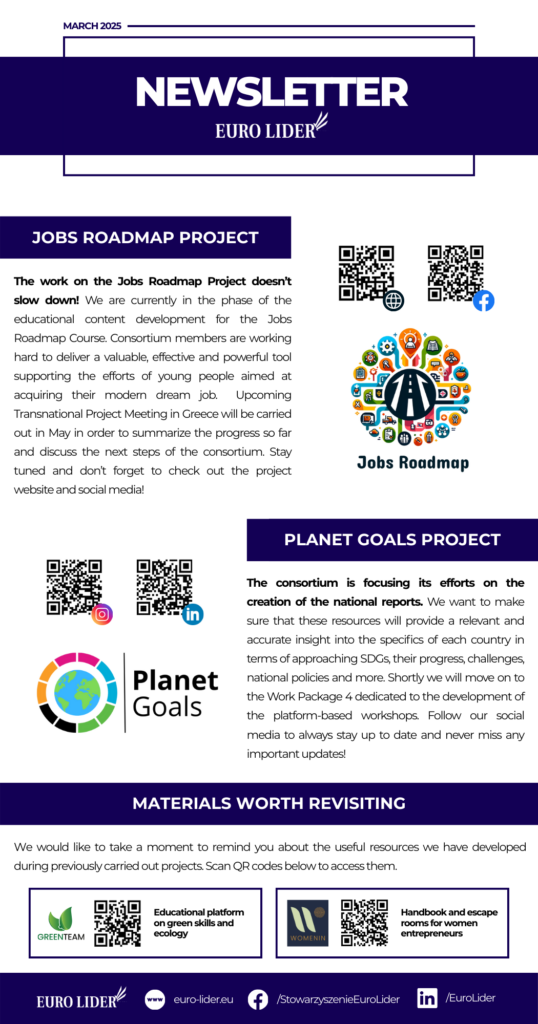 It’s time for the next Euro Lider’s monthly newsletter! This time we invite you to discover the latest news regarding the progress of the Jobs Roadmap and Planet Goals projects. Make sure to check out the full version of the newsletter, as we have also prepared for you a reminder of the valuable knowledge developed during the past projects we have participated in.